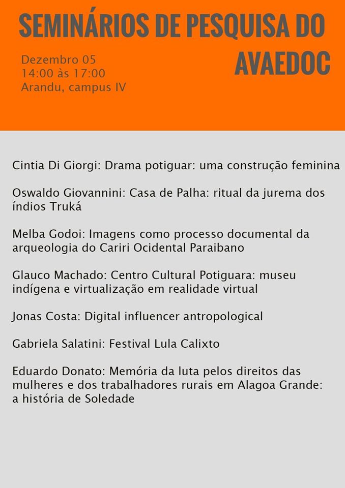 14 junho [transferido para 02/08/2024] Local: Labarandu – Laboratório de Antropologia Visual Arandu/Campus UFPB/Rio Tinto